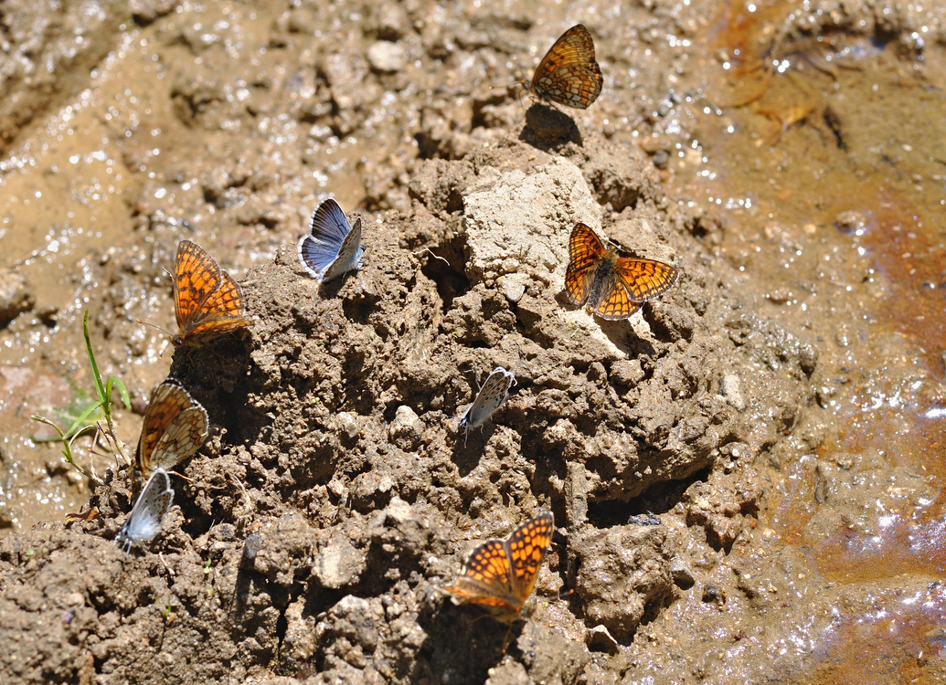 • im Schlamm, wo männliche Schmetterlinge Mineralien aufnehmen (um sie über Spermien an die Weibchen weiterzugeben)